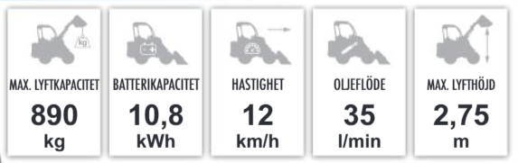 MultiOne EZ5 är utrustad med ett 10,8 kW litiumbatteri och väger bara 1020 kg. Tack vare ny batteriteknik kan den köra upp till 6 timmar i Eco-läge och 5 timmar i Power-läge, vilket gör den till ett kraftfullt verktyg i ett litet format. EZ5 har även en hydraulisk flödeskapacitet på 35 l/min, en 22-multifunktions joystick, en lyfthöjd på 2,75 m, en lyftkapacitet på 890 kg och en toppfart på 12 km/h med 23x10.50-12 däck.
