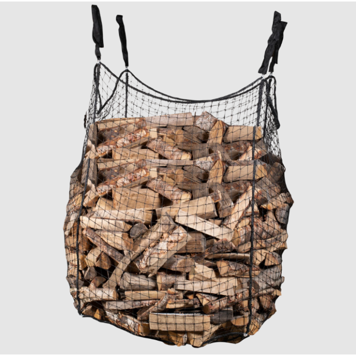 Säcken har fyra lyftstroppar upptill, vilket gör den enkel att flytta med pallgafflar. Den smarta bottentömningen gör det snabbt och smidigt att tömma veden – men se till att låstråden är korrekt knuten för att säkerställa enkel öppning vid tömning.