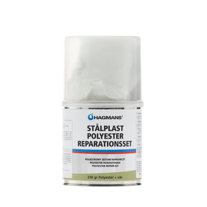 Hagmans StålPlast polyester reparationsset innehållande det du behöver för att göra en professionell och kostnadseffektiv reparation av genomgående hål i bilen, husvagnen, båten eller i hemmet.