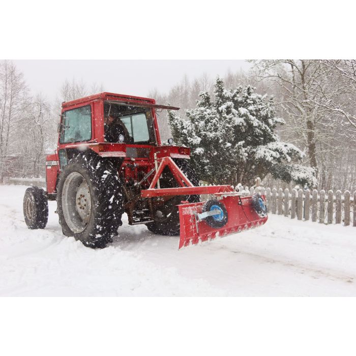 Schaktbladet är utrustat med ett utbytbart och vändbart skärstål med två funktioner – en slät sida för effektiv snöröjning och en räfflad sida för vägsladdning. Den svetsade hjulinfästningen ger stabilitet och hållbarhet, och för extra kontroll kan stödhjul köpas till.