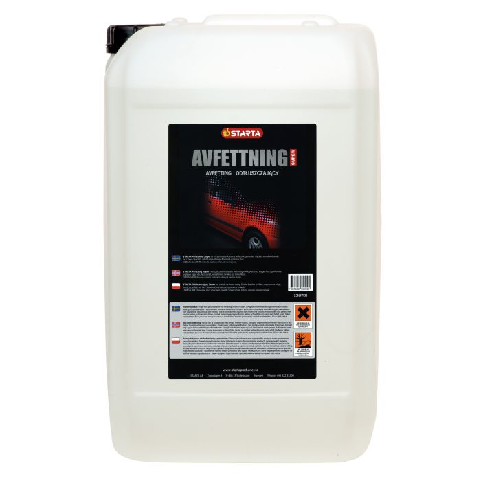 STARTA Avfettningsmedel är ett snabbseparerande, petroleumbaserat kallavfettningsmedel. Mycket snabbverkande och löser all olja, asfalt, fett, vägsalt m.m.