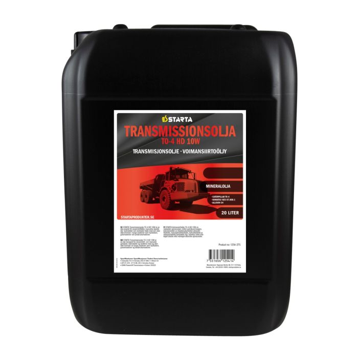 STARTA Transmissionsolja TO-4 HD 10W är en olja avsedd för powershiftlådor, manuella växellådor och slutväxlar både med och utan våta bromsar i tunga maskiner som hjullastare, grävmaskiner och jordbruksmaskiner.
