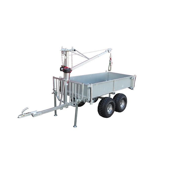 Har plant lastplan och vid lossning lyfter man upp stöttorna och placerar horisontalt i hylsor. Enkelt att rulla av virket och få bort lasten en bit från vagnen. Stöttorna är i båda lägen låsta med gummistroppar. Det hjälper till att lägesbestämma stöttorna och minskar lite på skrammel. Passerar hindren bra och rullar lätt då den gar osymmettrisk pendelboggi med frirullande däck. Konstruktionen ger en markfrigång på hela 385 mm. Roterande drag, varmförzinkad och C.E märkt.